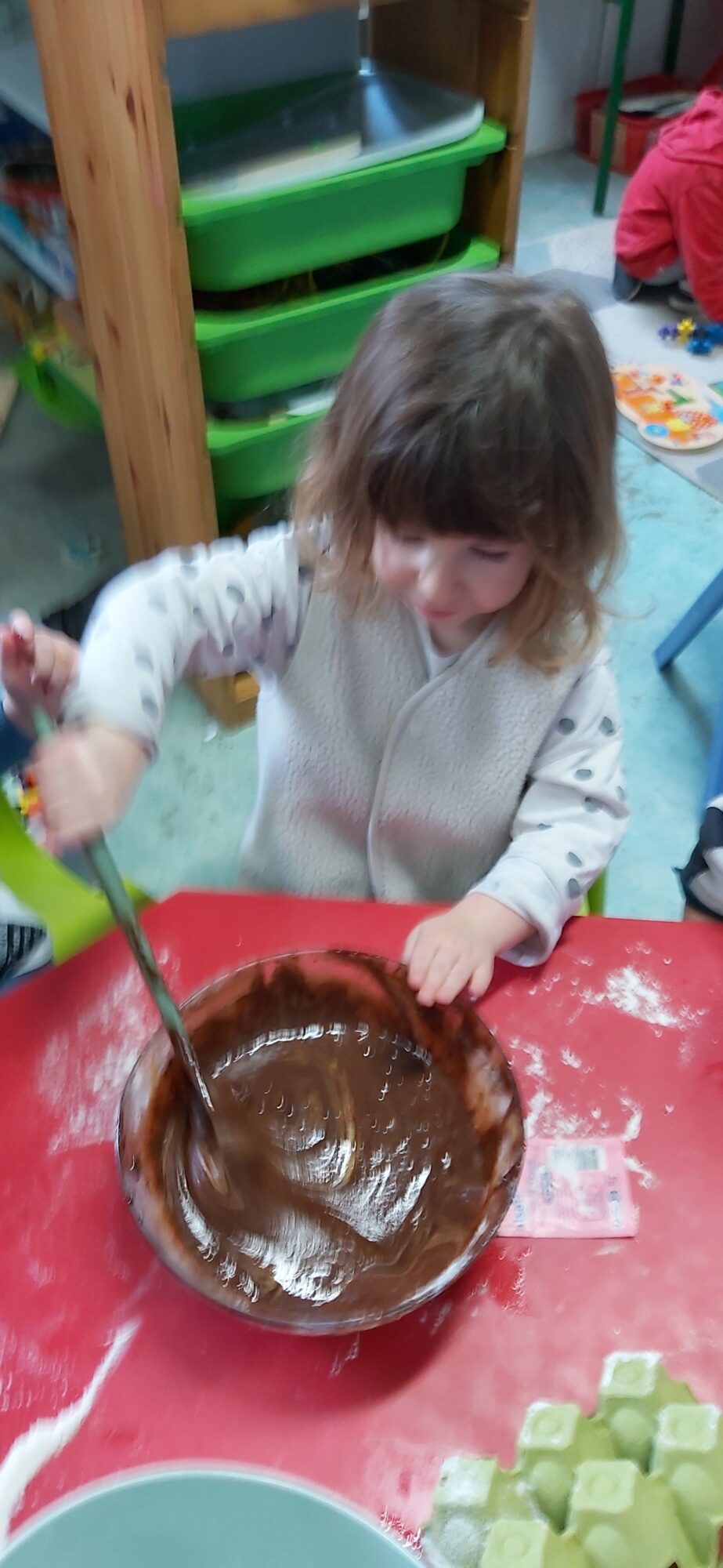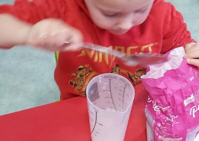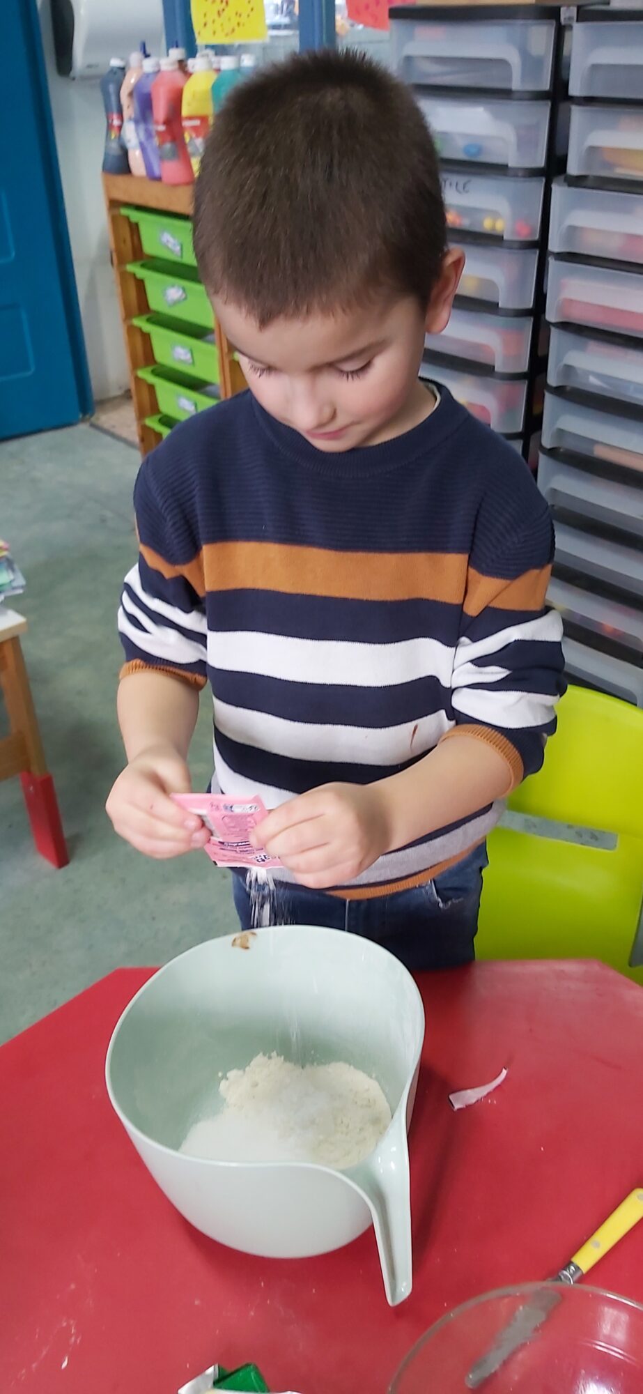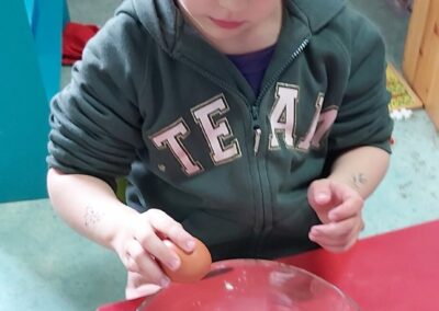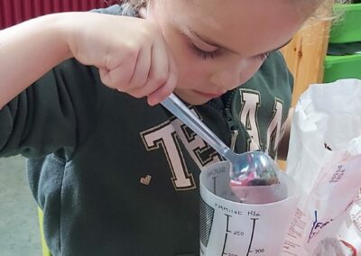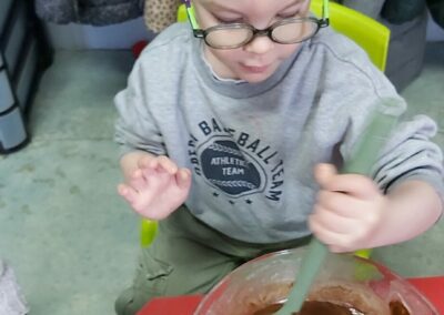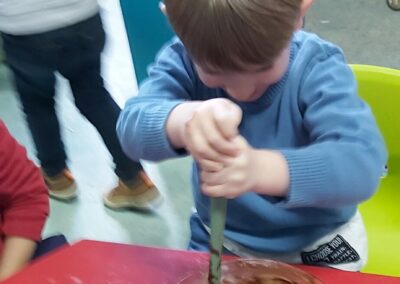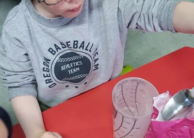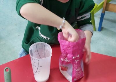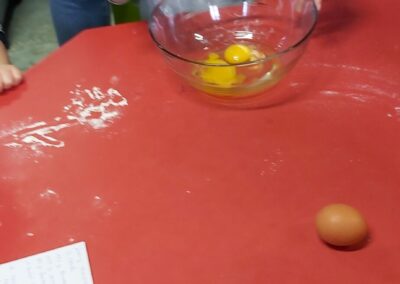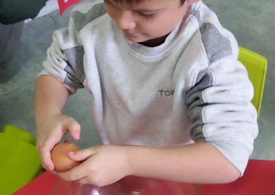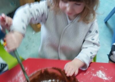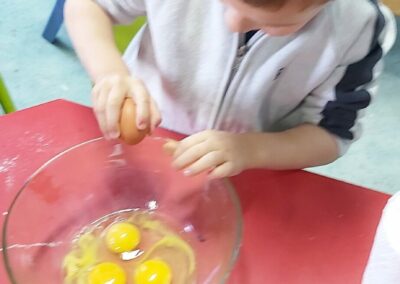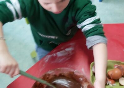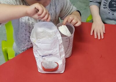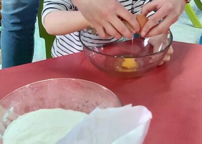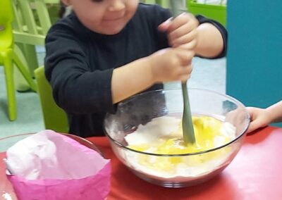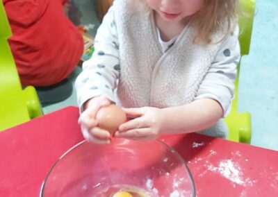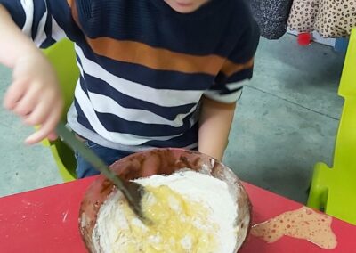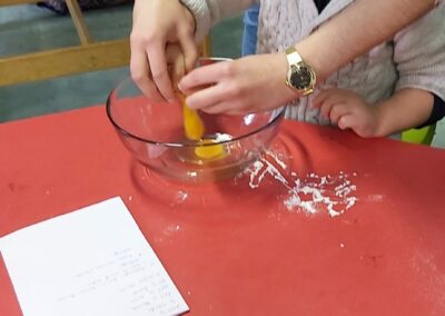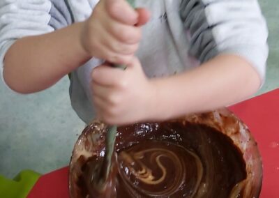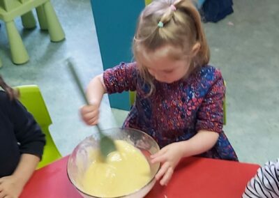 C’est l’occasion pour les enfants de découvrir les mélanges, les mesures, de travailler les quantités, la motricité fine. Atelier riche en apprentissages et très appréciés des enfants. Ils sont très fiers de déguster le fruit de leur travail !