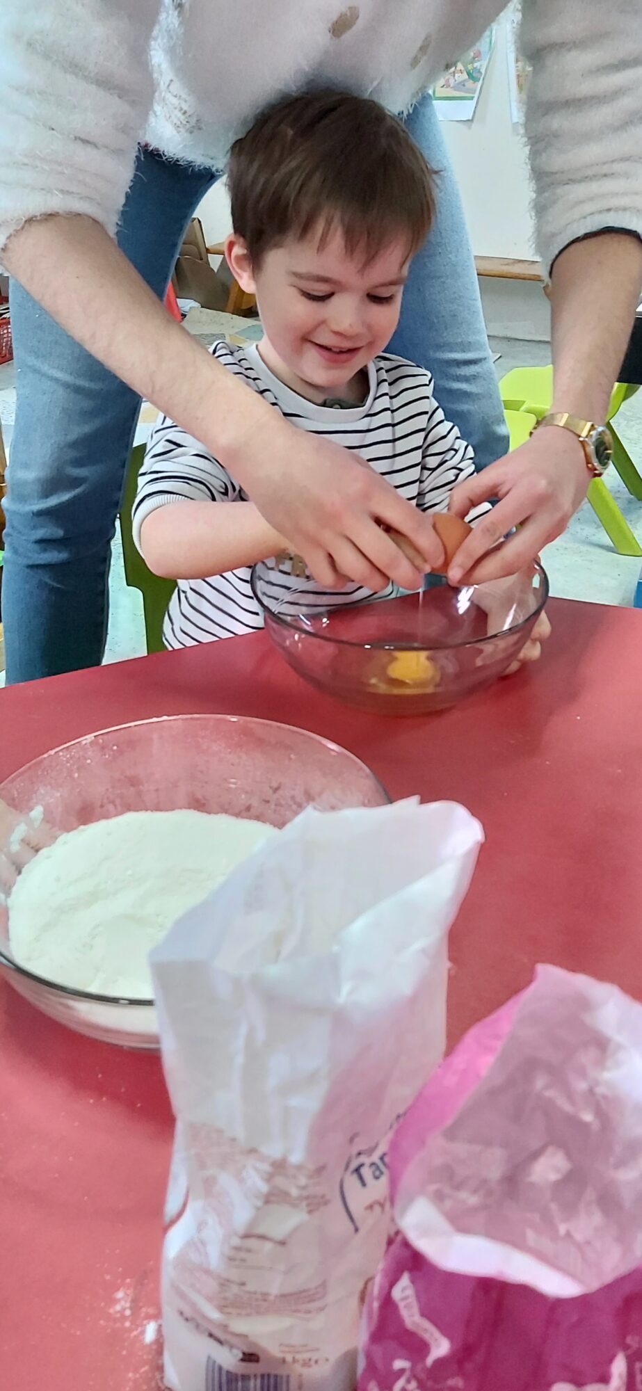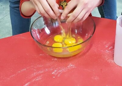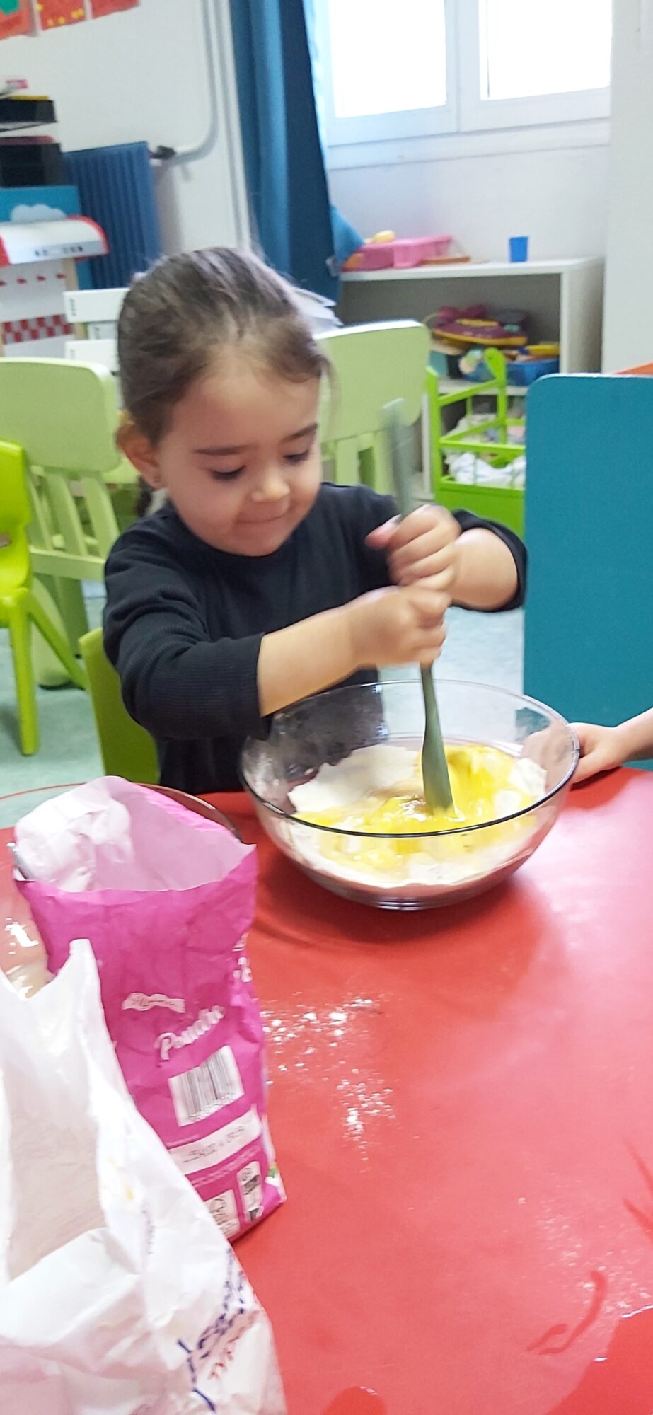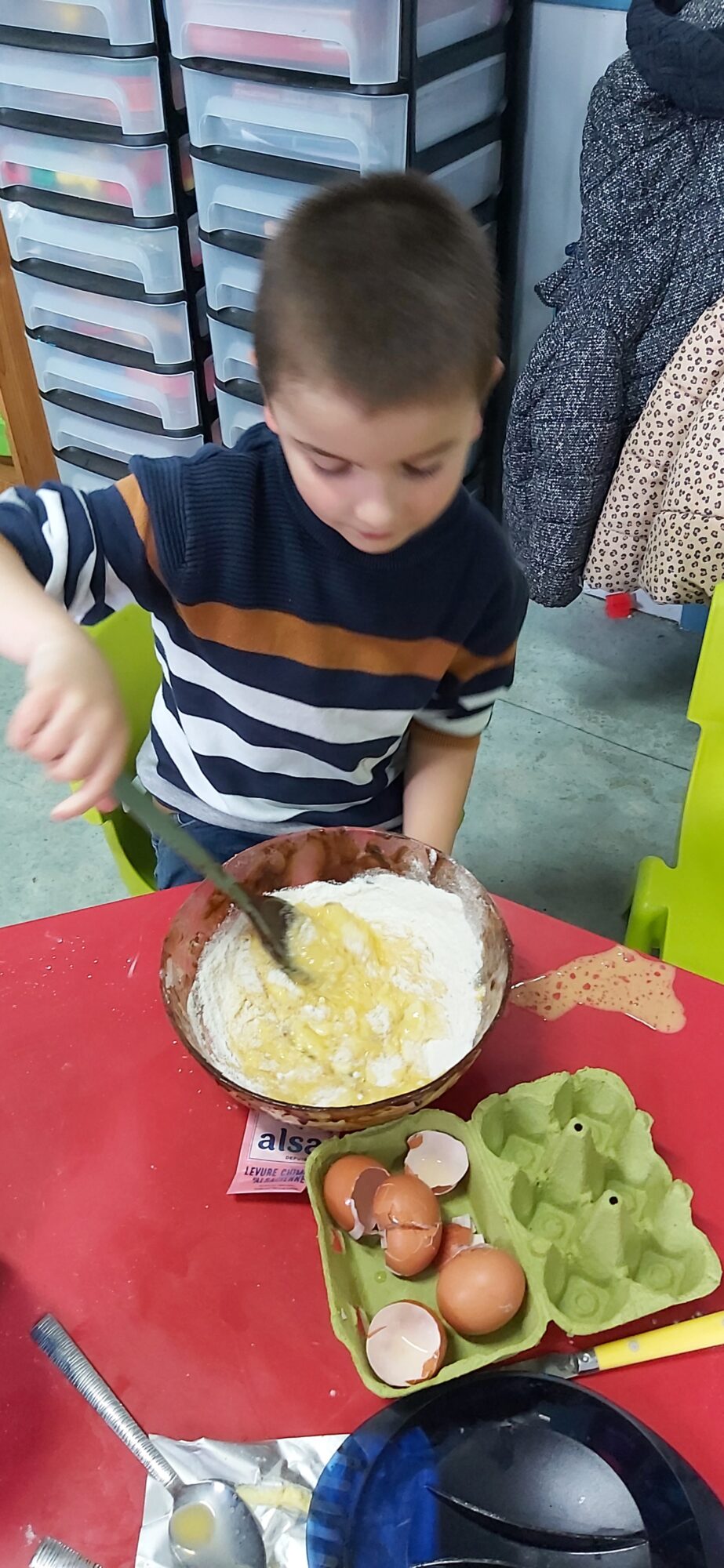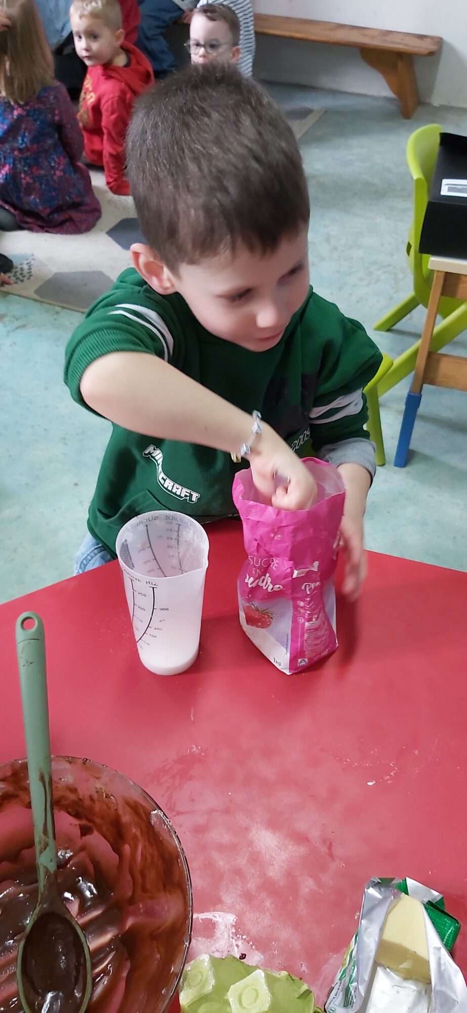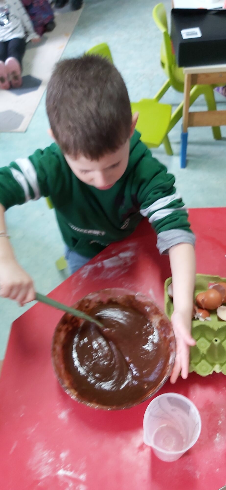 C’est l’occasion pour les enfants de découvrir les mélanges, les mesures, de travailler les quantités, la motricité fine. Atelier riche en apprentissages et très appréciés des enfants. Ils sont très fiers de déguster le fruit de leur travail !