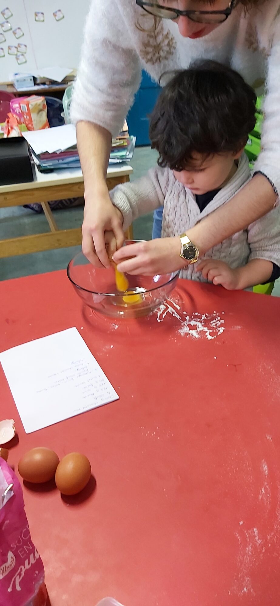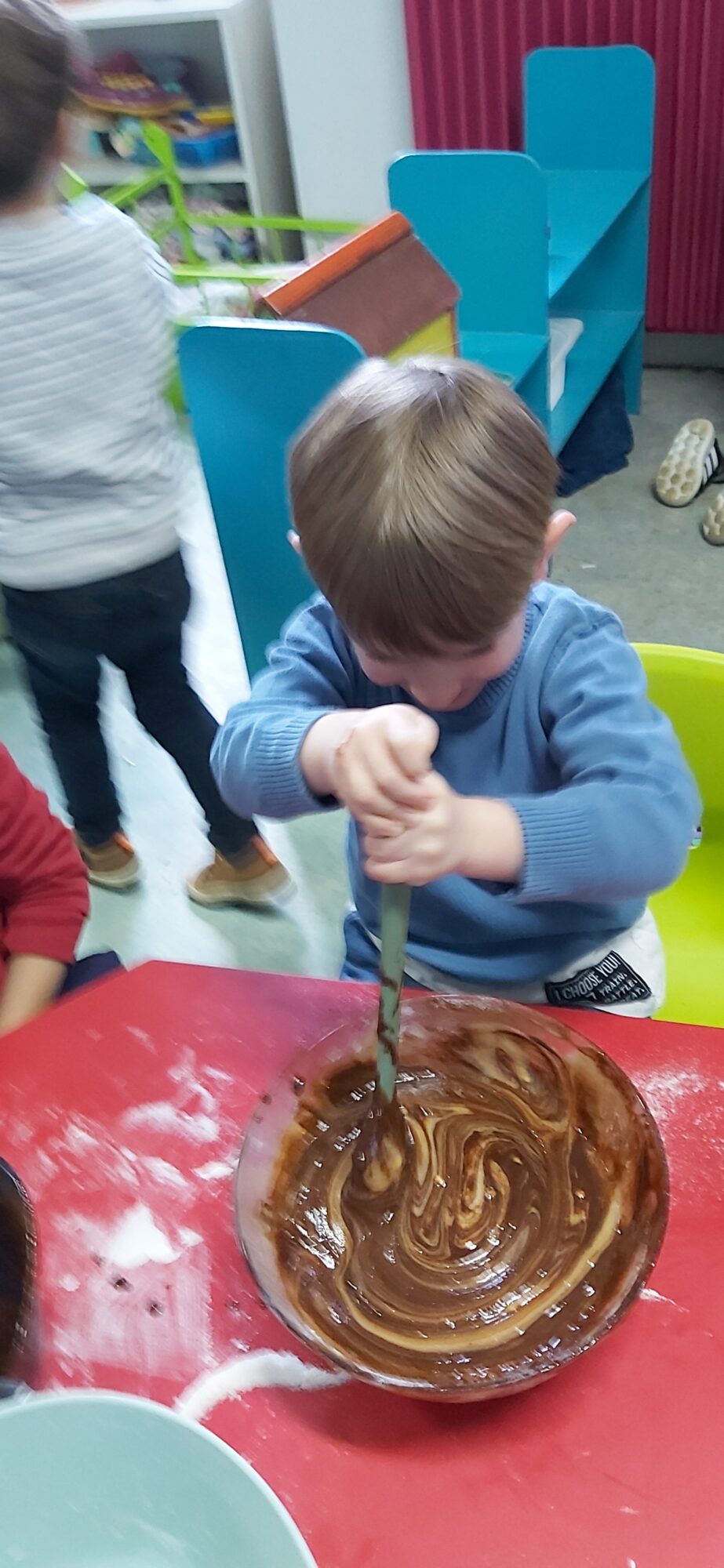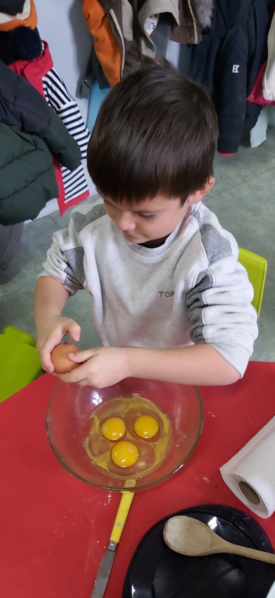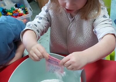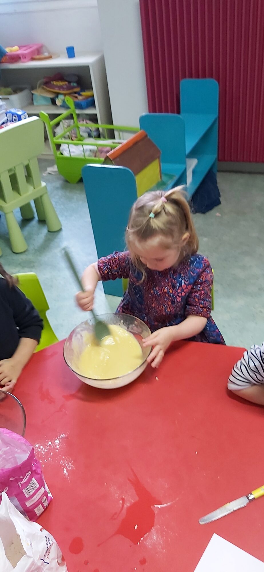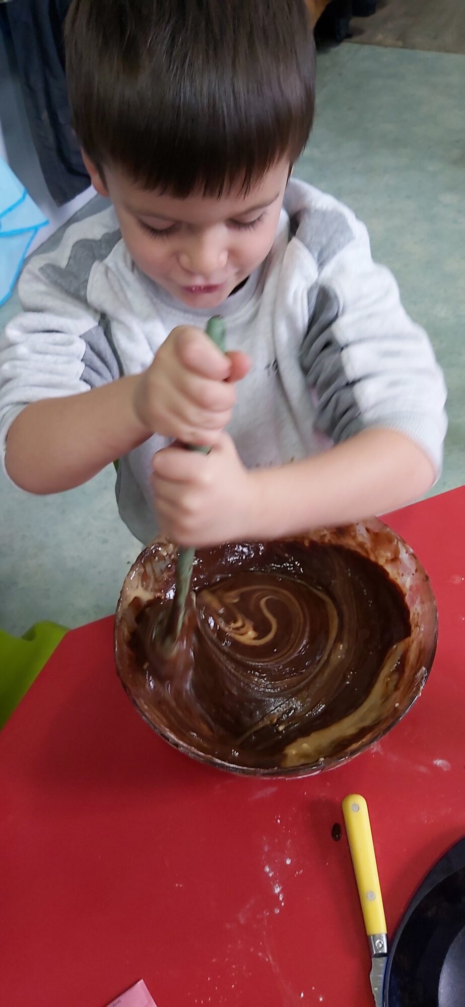 C’est l’occasion pour les enfants de découvrir les mélanges, les mesures, de travailler les quantités, la motricité fine. Atelier riche en apprentissages et très appréciés des enfants. Ils sont très fiers de déguster le fruit de leur travail !